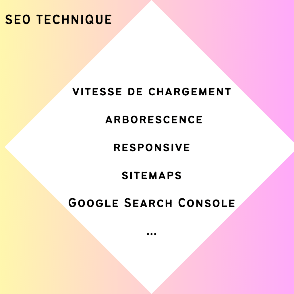 â Le SEO technique > vitesse de chargement du site, arborescence, responsive, sitemaps, lien avec la Google Search Console, etc.